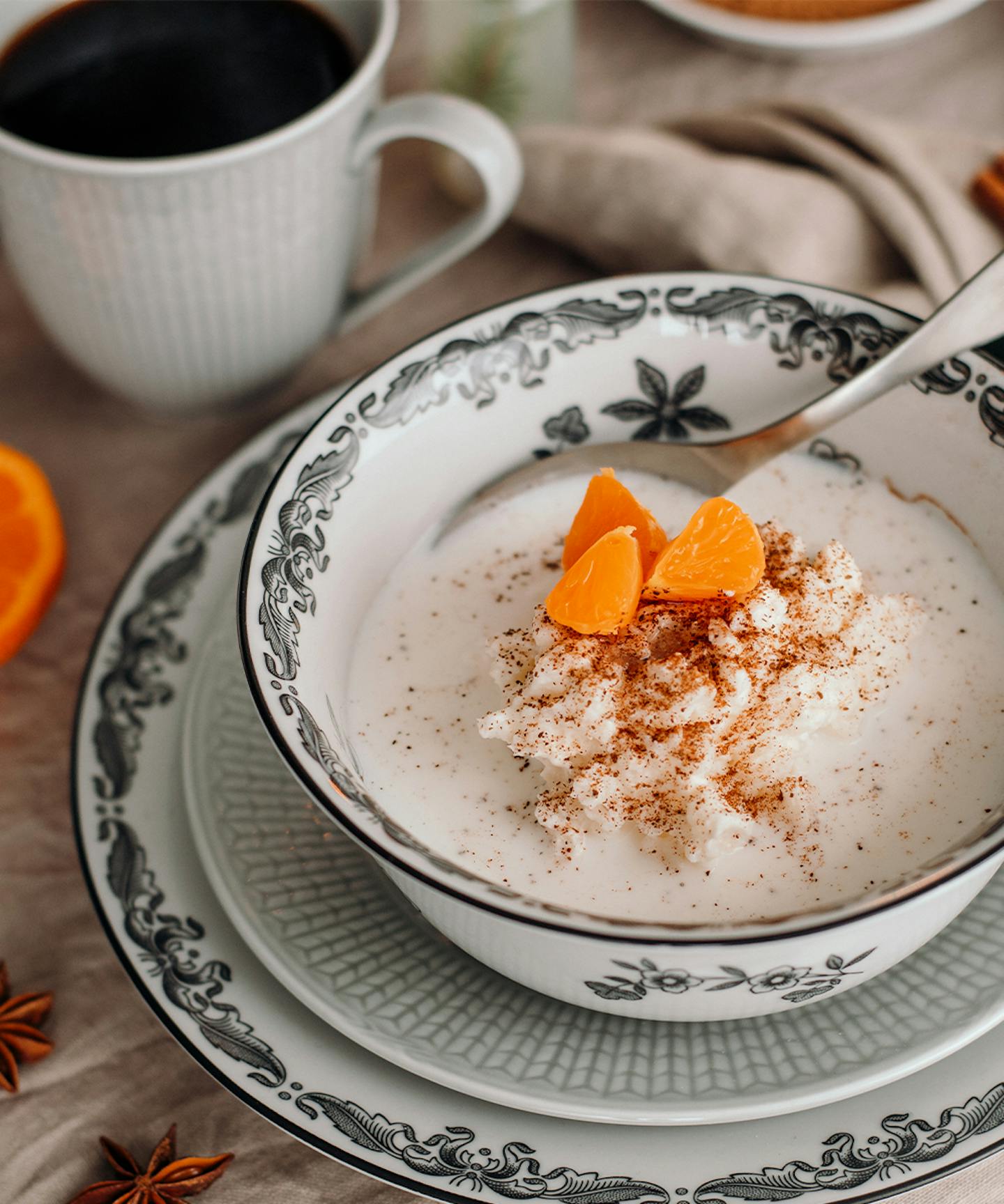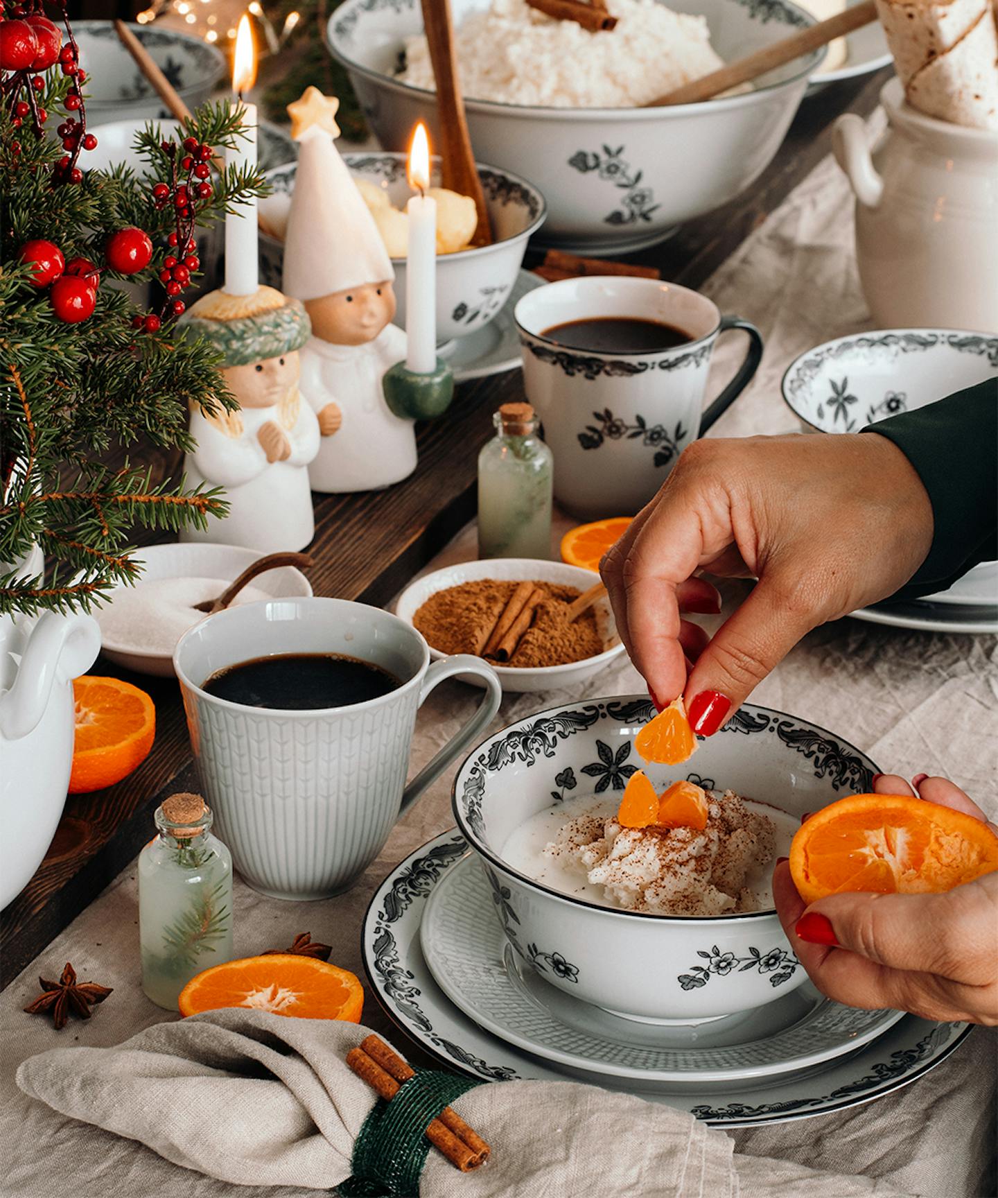 Begin your Christmas morning with a calm and elegant breakfast surrounded by the timeless design of Ostindia Black. The classic pattern, reimagined with a modern twist, sets the tone for a luxurious and sophisticated atmosphere. Pair it with dark linen napkins and deep red details, such as small poinsettias or sprigs of lingonberry, to create a warm and inviting table setting. Serve freshly baked bread, slices of Christmas ham, and a steaming cup of coffee for a breakfast that sets the mood for the day ahead.