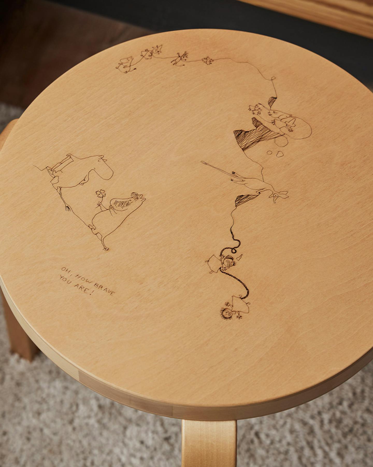 Alvar Aalto's Stool 60 is one of the most beloved pieces of furniture in design history and a symbol of Finnish design. With its simple, timeless design and versatility, there is always room for one more guest. The Stool 60 Celebration anniversary edition honours the legacy of both Aalto and Tove Jansson through laser-engraved original drawings by Jansson, subtly placed on the seat and legs. The playful line drawings, reminiscent of spontaneous sketches on an old school desk, give the stool a personal and charming character. To enhance its nostalgic look, it has been given a warm, honey-coloured finish.