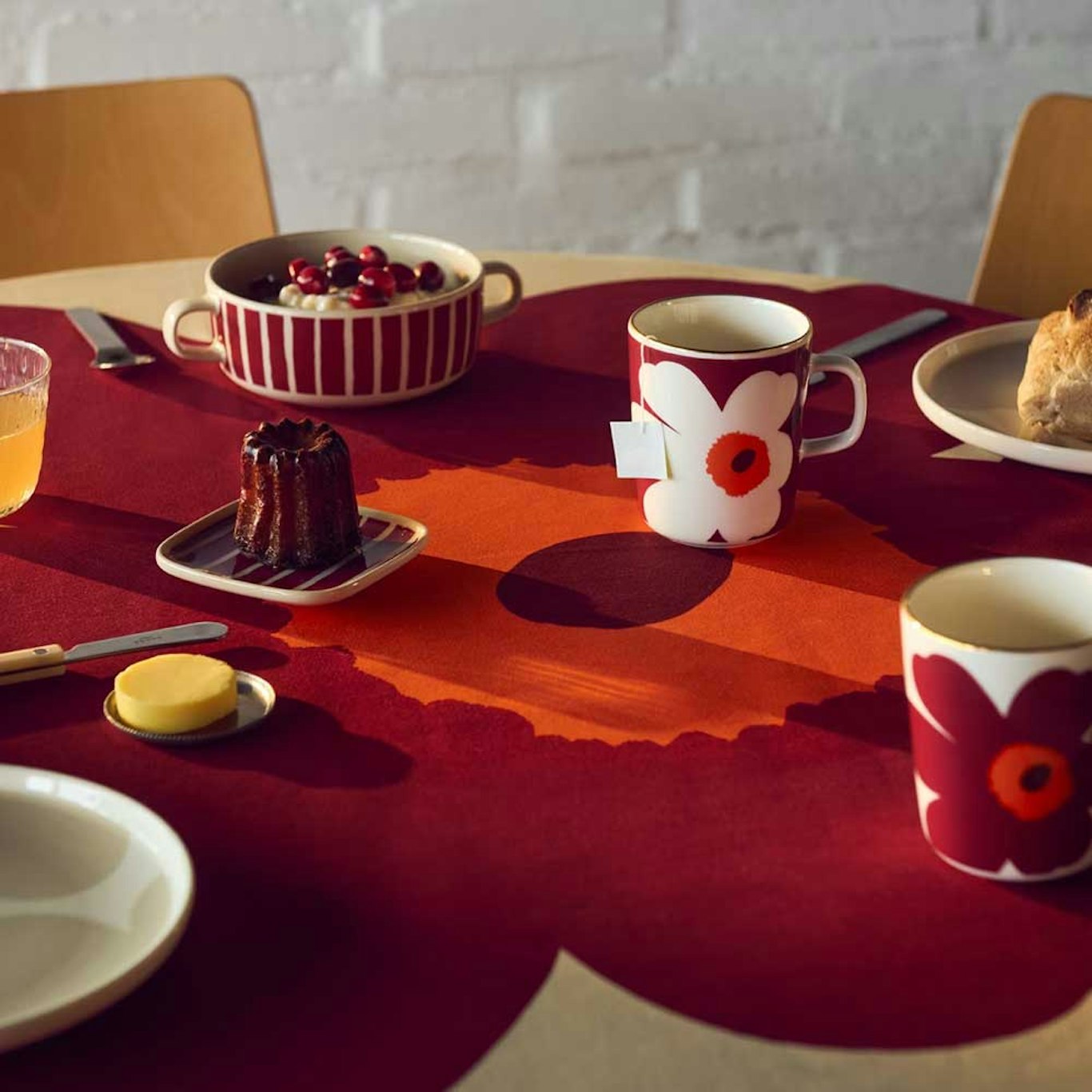 Unikko was born at a time when floral patterns were barely present in Marimekko’s collections. Designer Maija Isola nevertheless drew inspiration from the forms of flowers and created an entirely new series of expressive patterns. Now the iconic design returns in a new, deep red shade – a colour that combines warmth, depth and sophistication, perfect for this season’s tablescapes and interiors.